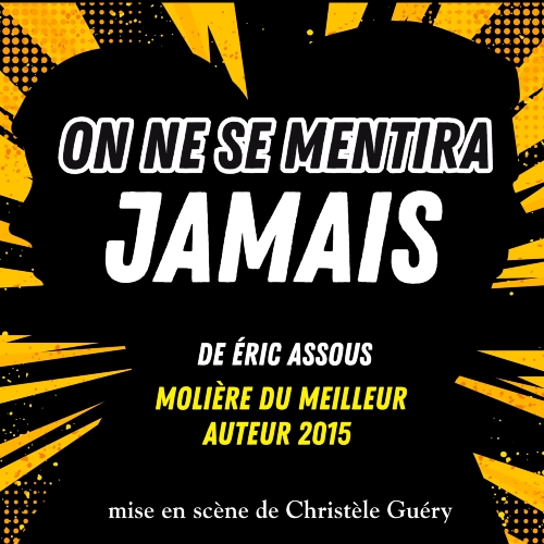 Afficher le planUne COMEDIE piquante sur le couple Marianne et Serge filent le parfait amour depuis vingt-cinq ans, du moins en apparence. Jusqu'au jour où un petit accident de voiture sans gravité va provoquer une pluie de questions et de remises en question du couple. Ce petit grain de sable va enrayer l’harmonie joyeuse de leur couple et installer le doute. Que faut-il dire ou ne pas dire? Et est-on prêt à entendre les réponses? Vous l'aurez compris, le fil rouge du spectacle tourne autour des petits et grands mensonges, sachant que toute vérité n'est pas forcément bonne à dire.La suspicion est un poison lent et subtil aux effets dévastateurs. Au bout de 25 ans, on croit bien connaître l’autre… Parfois, on a tort. Éric Assous, l’auteur de "On ne se mentira jamais!", est un habitué des succès nous fait entendre une nouvelle fois sa petite musique désabusée sur le couple qu’il n’en finit pas de disséquer sans concession, creusant les failles, explorant les fêlures d’un œil à la fois impitoyable et tendre. Il a la plume toujours aussi alerte, incisive, mordante, ironique : Mauvaise foi masculine et intuition féminine vont s’affronter dans une joute verbale infiniment jubilatoire On rit et on s’émeut de ce couple qui nous ressemble. Un rire en profondeur Avec Julie Toublanc et Jean marc Orjubin mise en scène Christèle Guéry